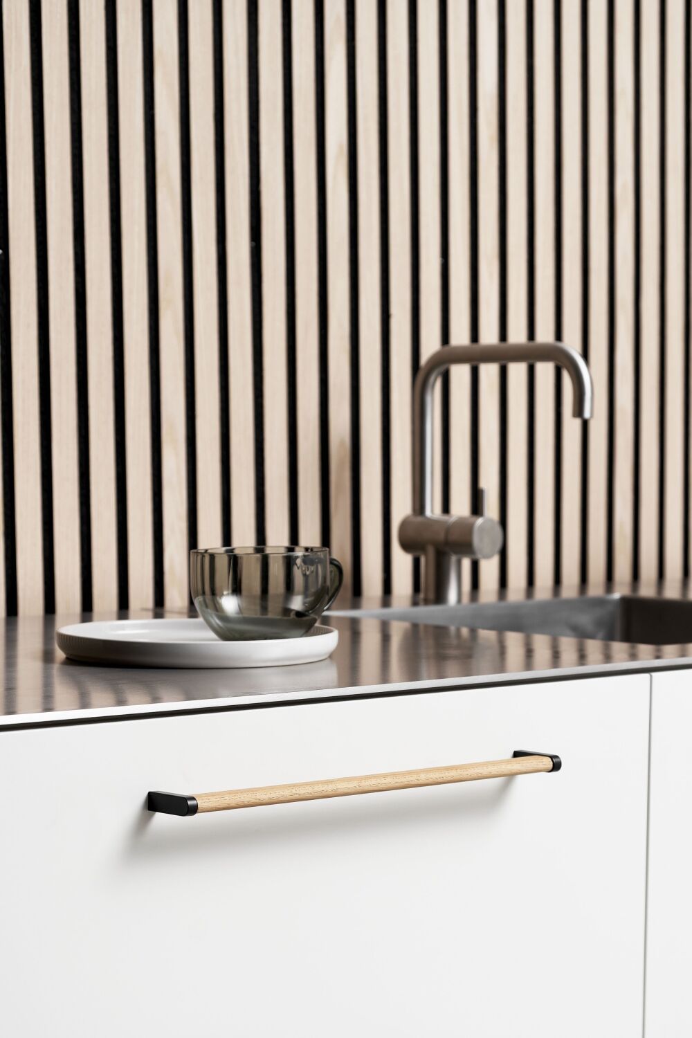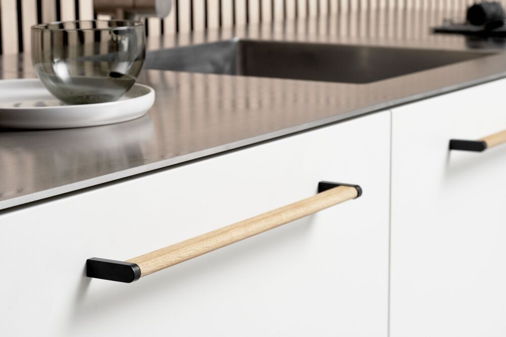 Het eikenhouten gedeelte van de greep straalt authenticiteit en warmte uit. Dit natuurlijke materiaal, gecombineerd met de strakke zwarte afwerking, zorgt voor een unieke en tijdloze uitstraling. Ideaal voor keukens die zowel moderniteit als een vleugje natuur willen uitstralen.
