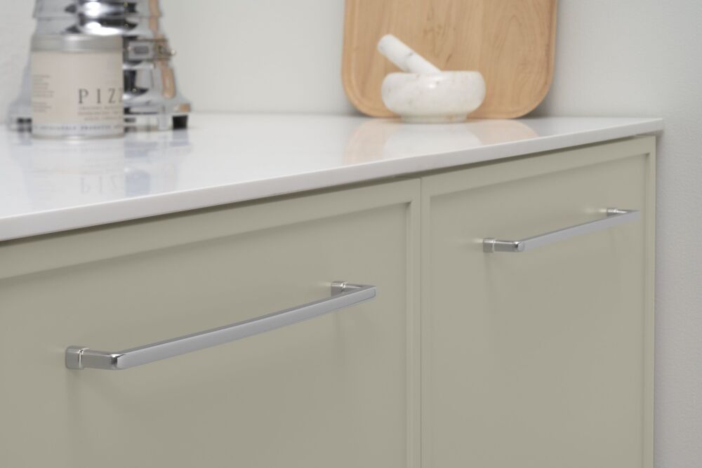 De Greep Equester in glimmend chroom biedt meer dan alleen functionaliteit. De opvallende glans, de keuze tussen twee maten, en de eenvoudige installatie maken deze greep tot een onderscheidende en praktische keuze voor elk interieur.